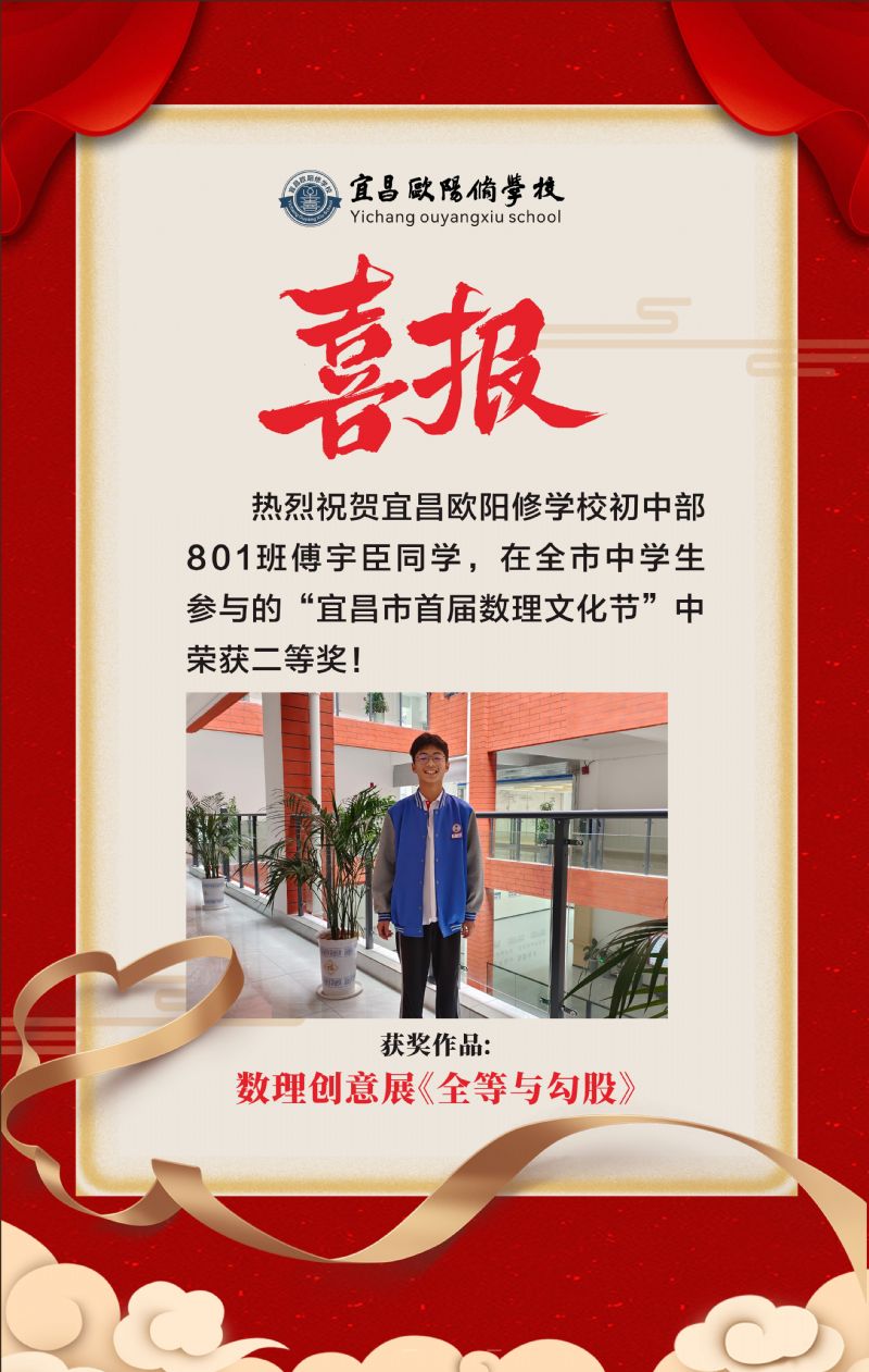 祝賀八年級傅宇臣同學(xué)在“宜昌市首屆中學(xué)生數(shù)理文化節(jié)”中獲獎!